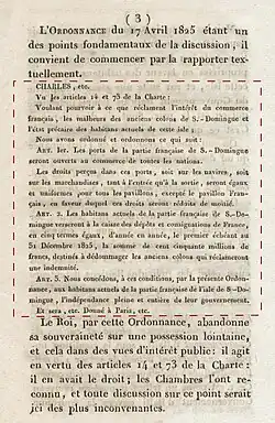 Los marinos franceses le exigieron al gobierno haitiano firmar la siguiente ordenanza, emitida por Carlos X, rey de Francia:[15]