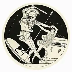 Ayax Telamonio es uno de los compañeros que se apresura al lugar donde Aquiles muere a manos de su prometida Polixena y las flechas de Paris le disparan en el talón. Una vez que el cuerpo es devuelto al campamento aqueo, se juzgan las armas del héroe, fabricadas por el divino Hefesto a instancias de Tetis, la madre del héroe. Áyax espera que Agamenón le otorgue el premio, ya que siempre se ha mostrado valiente y combativo en la batalla, pero Atenea, amiga de los griegos, con un truco hace que el rey entregue armas al astuto Odiseo. Cegado por la furia, Áyax jura venganza y se dirige a los bosques y pastos, matando a las cabras y ovejas que encuentra, primero atándolas a postes y luego convirtiéndolas en sangre, haciéndolas pasar como sus compatriotas enemigos.