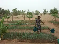 En Burkina Faso hay muchas personas dedicadas a la agricultura y en los pueblos rurales como Gando estas personas representan la gran mayoría. Este factor representa un problema potencial para la educación, porque las familias esperan una ayuda fundamental de sus hijas e hijos. Es entonces esencial darle a las niñas ynniños un conocimiento práctico de la agricultura, y al mismo tiempo tratar que la educación juegue un papel relevante. Por eso ha sido habilitada una parcela de terreno como huerto en el colegio, y se ha excavado un pozo para abastecer de agua al colegio y al pueblo. Paralelamente a las clases, las alumnas y alumnos aprenden cómo cuidar las plantas sin usar pesticidas o fertilizantes, animándoles a utilizar métodos sostenibles en el futuro. En una región donde la comida es escasa y la mayoría de las personas tiene una dieta repetitiva, con sus consecuentes déficits, el jardín del colegio representa una importante contribución para la mejora alimenticia.[3]