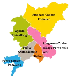 - la provincia de Belluno de la región de Véneto, comprendiendo las comunas de: Santo Stefano di Cadore, San Pietro di Cadore, Comelico Superiore, Danta di Cadore, San Nicolò di Comelico, Vigo di Cadore, Lozzo di Cadore, Lorenzago di Cadore, Domegge di Cadore, Pieve di Cadore, Calalzo di Cadore, Valle di Cadore, Perarolo di Cadore, Cibiana di Cadore, Vodo di Cadore, Zoppè di Cadore, Borca di Cadore, Ospitale di Cadore, Alleghe, Val di Zoldo, Agordo, La Valle Agordina, Taibon Agordino, Cencenighe Agordino, San Tomaso Agordino, Canale d'Agordo, Vallada Agordina, Falcade, Rocca Pietore, Colle Santa Lucia, Selva di Cadore, Cortina d'Ampezzo, Livinallongo del Col di Lana, Auronzo di Cadore, San Vito di Cadore, Voltago Agordino, Rivamonte Agordino, Gosaldo, Sospirolo, Belluno, Sedico, Limana, San Gregorio nelle Alpi, Santa Giustina, Cesiomaggiore, Feltre, Lamon, Sovramonte, Pedavena, Alpago, Seren del Grappa, Chies d'Alpago, Tambre, Ponte nelle Alpi, Soverzene, Longarone y una pequeña porción de Setteville (creada en 2014 por fusión de las comunas de Alano di Piave y Quero Vas).[nota 1]