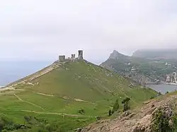 Los genoveses se establecieron en Crimea en 1266 cuando los mongoles les cedieron la ciudad de Caffa, iniciando la colonia de Gazaria. Según fuentes escritas, los genoveses comenzaron a establecerse en las laderas del monte Castron en 1343, que pertenecía al Principado de Teodoro. Incluso antes de la llegada de los genoveses, gracias a la obra misionera los franciscanos tenían allí un convento. En 1354 el kan Janibek de la Horda de Oro quemó esta fortificación y la población tuvo que huir. En 1357 los genoveses comenzaron la reconstrucción de la fortaleza y en 1380 el kan Tokhtamysh de la Horda de Oro firmó un tratado de paz con los genoveses y reconoció su derecho a poseer la fortaleza, que a partir de ese momento pasó a conocerse como Cembalo.
