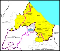 - la provincia de Rímini de la región de Emilia-Romaña, comprendiendo las comunas de: Bellaria-Igea Marina, Cattolica, Coriano, Gemmano, Misano Adriatico, Mondaino, Montefiore Conca, Montegridolfo, Montescudo-Monte Colombo, Morciano di Romagna, Poggio Torriana, Riccione, Rímini, Saludecio, San Clemente, San Giovanni in Marignano y Verucchio;