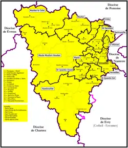 El 6 de octubre de 1822 se restableció la diócesis de Chartres mediante la bula Paternae caritatis del papa Pío VII, obteniendo su territorio de la diócesis de Versalles.[3] El territorio diocesano quedó, por tanto, reducido al único departamento de Sena y Oise, que estaba formado por porciones considerables de las antiguas diócesis de París, Chartres, Ruan y Sens y algunos cantones tomados de las diócesis de Beauvais, Senlis y Évreux.