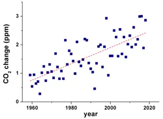 - ↑ Dr. Pieter Tans (3 May 2008) "Annual CO2 mole fraction increase (ppm)" for 1959–2007 National Oceanic and Atmospheric Administration Earth System Research Laboratory, Global Monitoring Division (additional details.)