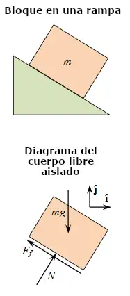 El diagrama de cuerpo libre del bloque sobre el plano inclinado es una aplicación sencilla de estos principios: