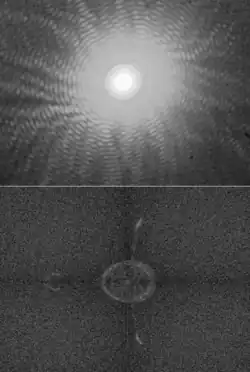 La difracción de Bragg se observa tanto con radiación electromagnética de longitud de onda muy corta como los rayos X u ondas de materia como los neutrones y electrones cuya longitud de onda es del orden del espaciamiento atómico o mucho menor.[14] El patrón producido da información de las separaciones de los planos cristalográficos d, permitiendo deducir la estructura cristalina. El contraste por difracción, en los microscopios electrónicos y en los dispositivos de x-topografía en particular, es también un poderoso instrumento para examinar los defectos individuales y los campos de tensión locales en los cristales.
