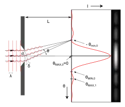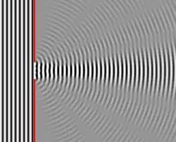 En física clásica, el fenómeno de difracción está descrito por el Principio de Fresnel - Huygens que trata a cada punto en el frente de una onda propagadora como un grupo de ondículas esféricas individuales.[1] El patrón de interferencia característico es más marcado cuando una onda de una fuente coherente (como un láser) se encuentra a una rendija/abertura que es comparable en tamaño a su longitud de onda, como es mostrado en la imagen insertada. Esto se debe a la adición, o interferencia, de los diferentes puntos en el frente ondulatorio (o, equivalentemente, de cada ondícula) que viajan por trayectorias de diferentes longitudes a la superficie de registro. Sin embargo, si son múltiples aberturas muy cercanas, pueden resultar en un patrón complejo de intensidad variable.