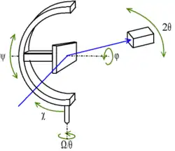 En la geometría euleriana, uno de los ejes —denominado por la letra griega χ o 'chi'— permite una rotaciónde la muestra de 360 grados en el plano vertical. Esta construcción presenta la ventaja de ser mecánicamente muy estable, pero dificulta la instalación de instrumentos auxiliares para controlar las condiciones de la muestra durante el experimento, como temperatura, presión, etc. En la geometría kappa, se sustituye el eje chi por un κ o 'kappa' no ortogonal al eje phi,[11] que mejora la accesibilidad a la muestra, y con una orientación tal que, en combinación con el círculo exterior del goniómetro —ω u 'omega'— se obtine una rotación del cristal equivalente a 90 grados sobre el círculo euleriano chi.[9]