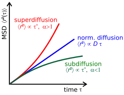 A diferencia de la difusión normal, la difusión anómala se describe mediante una ley de potencia,[2][3] σr2 ~ D t α, donde D es el coeficiente de difusión y t es el tiempo transcurrido. En un proceso de difusión normal, α = 1. Si α > 1, el fenómeno se denomina superdifusión. La superdifusión puede ser el resultado de procesos activos de transporte celular. Si α <1, la partícula se somete a subdifusión.[4][5]