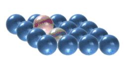 - Tanto los experimentos como las simulaciones han demostrado que en algunos sistemas se producen saltos de rebote. Dado que el movimiento no da lugar a un desplazamiento neto del adátomo implicado, la evidencia experimental de los saltos de rebote procede de nuevo de la interpretación estadística de las distribuciones atómicas. En la figura 6 se muestra un salto de rebote. Sin embargo, la figura es ligeramente engañosa, ya que los saltos de rebote sólo se han demostrado experimentalmente en el caso de difusión 1D en una superficie canalizada (en particular, la cara bcc (211) del wolframio).[20]