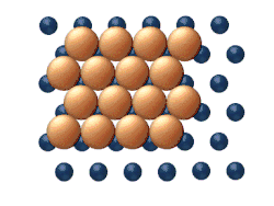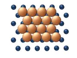- El intercambio atómico implica el intercambio entre un adátomo y un átomo adyacente dentro de la red superficial. Como se muestra en la figura 4, tras un evento de intercambio atómico el adátomo ha ocupado el lugar de un átomo superficial y el átomo superficial ha sido desplazado y ahora se ha convertido en un adátomo. Este proceso puede tener lugar tanto en heterodifusión (por ejemplo, adátomos de Pt sobre Ni) como en autodifusión (por ejemplo, adátomos de Pt sobre Pt). Desde un punto de vista teórico, todavía no está claro por qué el mecanismo de intercambio atómico es más predominante en unos sistemas que en otros. La teoría actual apunta hacia múltiples posibilidades, entre las que se incluyen las tensiones superficiales de tracción, la relajación de la superficie sobre el adátomo y una mayor estabilidad del intermedio debido a que los dos átomos implicados mantienen altos niveles de coordinación durante todo el proceso.[14][15]