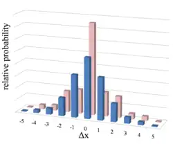 - Los saltos largos consisten en el desplazamiento de un adátomo a un lugar de adsorción no próximo. Pueden incluir saltos dobles, triples y más largos en la misma dirección en la que se desplazaría un salto de vecino más cercano, o pueden ir en direcciones completamente diferentes, como se muestra en la figura 6. La teoría ha predicho que se producen saltos largos. La teoría ha predicho su existencia en muchos sistemas diferentes y los experimentos han demostrado que se producen a temperaturas tan bajas como 0,1 Tm (temperatura de fusión). En algunos casos, los datos indican que los saltos largos dominan el proceso de difusión sobre los saltos simples a temperaturas elevadas; el fenómeno de longitudes de salto variables se expresa en diferentes distribuciones características del desplazamiento atómico a lo largo del tiempo (véase la figura 7).[19]
