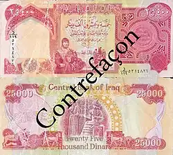 | 25.000 Dinares | Rojo | Granjero kurdo | Estela del Código de Hammurabi |