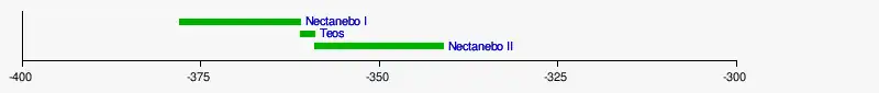Nectanebo I consiguió el control sobre Egipto en noviembre de 380 a. C., pero pasó la mayor parte de su reinado defendiéndose de los intentos persas de reconquista, con la ocasional ayuda de Esparta o Atenas. En el año 365 a. C. Nectanebo convirtió en corregente a su hijo y heredero Teos, que tras la muerte de su padre invadió los territorios del Levante mediterráneo (actuales Siria e Israel) con cierto éxito, hasta que fue depuesto por su hijo Tjahepimu,[1]​ que aprovechó la impopularidad de Teos para nombrar faraón a su propio hijo, Nectanebo II. El ejército egipcio apoyó a Nectanebo, y Teos se vio obligado a refugiarse en la corte persa.[2]