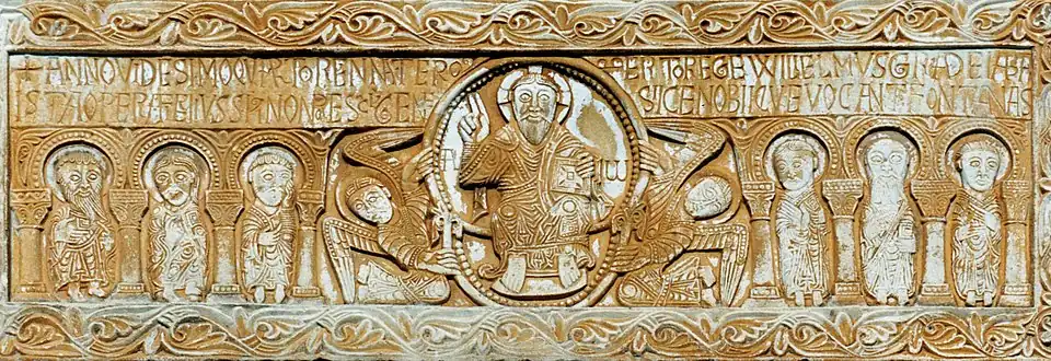 ✠ El año veinticuatro del reino de Roberto, rey, Guillermo, abad por la gracia de Dios, ordenó hacer esta obra en honor de san Genís del cenobio que se llama Fontanes.✠