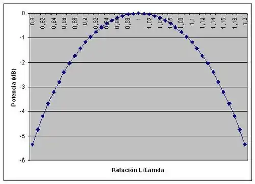 Así, igualando a uno la relación entre longitud de onda y la longitud de la antena y variando dicha relación, obtenemos el gráfico de distribución de potencia de un dipolo en relación con la frecuencia de trabajo.