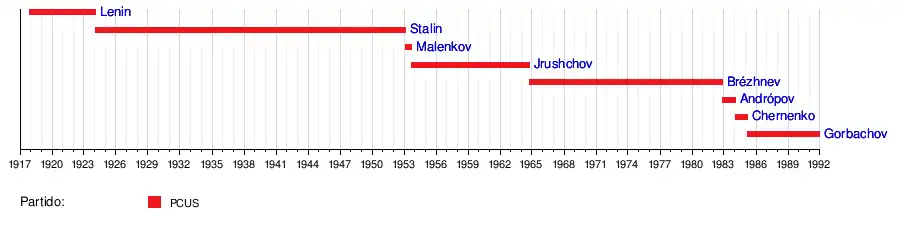 21 de enero de 1924[13] – 5 de marzo de 1953[36] | 13.º–19.º Congreso | Fue Secretario General desde el 3 de abril de 1922 hasta la abolición del cargo en octubre de 1952.[37] Stalin también sirvió como Presidente del Consejo de Ministros desde el 6 de mayo de 1941 hasta su muerte el 5 de marzo de 1953.[36] También ocupó el cargo de Ministro de Defensa desde el 19 de julio de 1941 hasta el 3 de marzo de 1947, Presidente del Comité de Defensa del Estado durante la Gran Guerra Patriótica[38] y se convirtió en el único funcionario en ocupar el cargo del Comisariado del Pueblo para las Nacionalidades desde 1921 hasta 1923.[39] | |