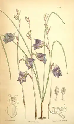 Es una planta delicada, con aspecto de hierba, con unas cuantas hojas suaves, la inflorescencia con unas pocas flores, generalmente de color azul, con pétalos ovalados y labelo falcado.