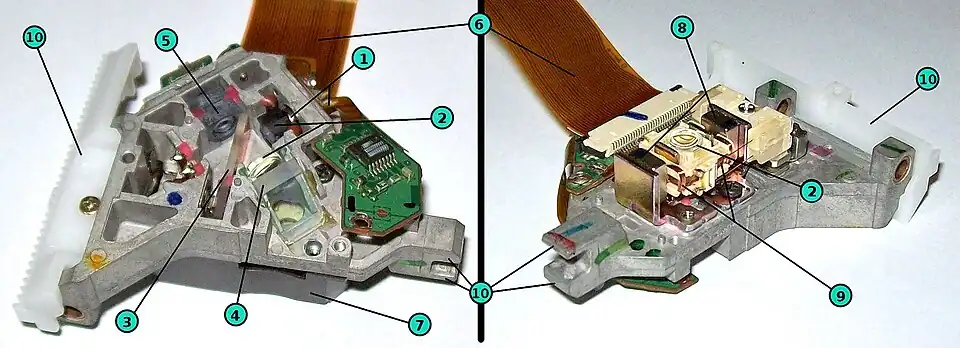 - Un cabezal, en el que hay un emisor de rayos láser, que dispara un haz de luz hacia la superficie del disco, y que tiene también un fotorreceptor (foto-diodo) que recibe el haz de luz que rebota en la superficie del disco. El láser suele ser un diodo AlGaAs con una longitud de onda en el aire de 780 nm. (Cercano a los infrarrojos, nuestro rango de visión llega hasta aproximadamente 700 nm.) por lo que resulta una luz invisible al ojo humano, pero no por ello inocua. Ha de evitarse siempre dirigir la vista hacia un haz láser para evitar ceguera o daños a la visión, por lo que los lectores están diseñados para evitar que los consumidores logren ver la luz láser y se recomienda su reparación solo por personal calificado[16]. La longitud de onda dentro del policarbonato es de un factor n=1.55 más pequeño que en el aire, es decir 500 nm.