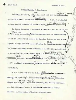 | «Ayer, 7 de diciembre de 1941, Estados Unidos de América fue atacado repentina y deliberadamente por fuerzas navales y aéreas del Imperio del Japón» | ||