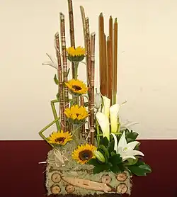 Los diseños florales, arreglos o decoraciones incorporan los elementos del diseño floral:[3] línea, forma, espacio, textura y color y los principios del diseño floral:[3] balance, proporción, ritmo, contraste, armonía y unidad.[4]