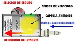 Emplea la fuerza de tracción de un resorte para trasladar la posición de la aguja de cierre del contenedor, en el sentido de apertura del mismo. El proceso se realiza una vez el dispositivo ha iniciado la secuencia de activación, han sido liberados los seguros, permitiendo que el resorte, o grupo de ellos, se expanda dentro de su alojamiento guía, provocando con su elongación una tracción del anclaje con la aguja, o cable de cierre del contenedor, realizando la apertura del mismo.