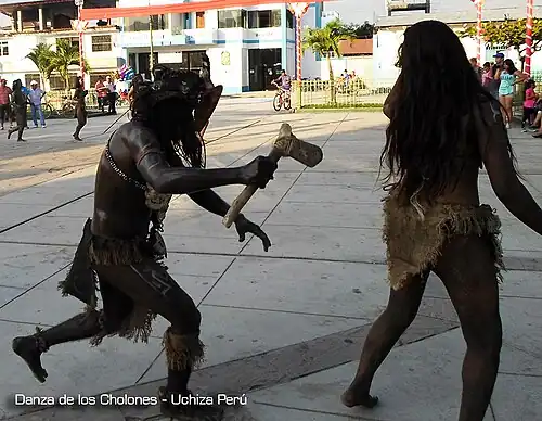 Danzan pintados con la jagua, portando una uchina junto a sus armas, el shollento acompaña el paso de los guerreros que beben masato hasta embriagarse.