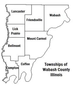 El condado de Wabash es uno de los 17 condados de Illinois que usa oficialmente el término precinct en lugar de township para designar a sus subdivisiones. No obstante, con frecuencia son llamadas civil townships.