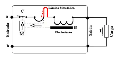 Presente en los disyuntores térmicos y magnetotérmicos. Está compuesto por un bimetal calibrado por el que circula la corriente que alimenta la carga. Cuando ésta es superior a la intensidad para la que está construido el aparato, se calienta, se dilata y provoca que el bimetal se arquee, con lo que se consigue que el interruptor se abra automáticamente. Detecta las fallas por sobrecarga.