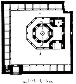 El Divankhane está enmarcado en tres lados por una arcada puntiaguda, en el centro de la composición, con un gran altura, se encuentra una rotonda octogonal: el pabellón propiamente dicho. La sala de esta rotonda está rodeada por una galería abierta del mismo orden. El revestimiento elíptico con una corona ligeramente puntiaguda está protegido en el exterior por una cúpula de piedra facetada. La fachada occidental de la rotonda se destaca por un portal decorado con arabescos,[13] la media hornacina está canulada con un elemento decorativo de yeso, basada en un sistema de estalactitas finamente modeladas llamadas mocárabe. Los tímpanos y los planos elevados todos están ornamentados, El portal conduce al dosel que conecta la sala con la cripta ubicada en las salas del estilobato y de servicio situadas una encima de la otra.[14]