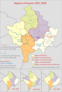 Los 5 antiguos distritos de Kosovo eran: Peć, Kosovo Mitrovica, Prizren, Kosovo Pomoravlje y Kosovo que agrupaban 31 municipios de la provincia. Algunos de ellos sufrieron cambios: