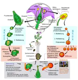 Debido a las dos fusiones de núcleos, se habla de doble fecundación. El cigoto formará el embrión luego de sucesivas divisiones mitóticas y el endospermo será el tejido nutricio encargado de soportar el crecimiento inicial del embrión. Ambos, el embrión y el endospermo, forman la semilla que dará origen a una nueva planta.
