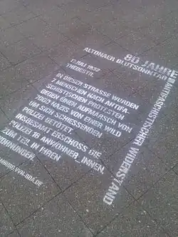 - ↑ Bruhn, Naomi (30 de julio de 2018). «Erinnerung an den „Blutsonntag“: Als in „Klein-Moskau“ Schüsse fielen». Die Tageszeitung: taz (en alemán). ISSN 0931-9085. Consultado el 20 de diciembre de 2023.