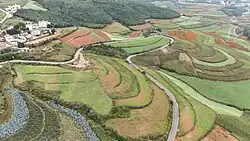 Las Tierras Rojas de Dongchuan constituyen una región montañosa, conocida por la singular riqueza cromática de su suelo. Este terreno, de naturaleza agreste y alto contenido en óxidos de hierro, presenta una predominancia de tonalidades rojizas que contrastan con franjas de color verde, naranja y amarillo, producto de la vegetación y los distintos cultivos que allí se desarrollan.