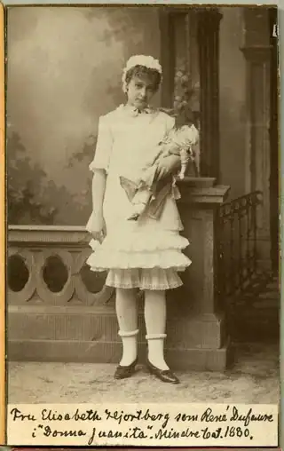 ![]() Elisabeth Hjortberg como René Dufour en un montaje de Donna Juanita en el Mindre teatern (Estocolmo) en 1880 (fotografía de Gösta Florman). | ||
