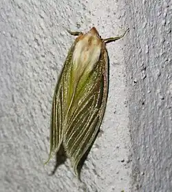 Es una polilla grande con una envergadura de 60 milímetros (2,4 plg) y de color ocre pálido y su frente pardusca.[3] Ambas alas son moderadamente robustas, muy brillantes, de color blanquecino ocre. El ala anterior cuenta con vetas pardo doradas pálidas en el margen costal, en las venas y los espacios intercostales que se vuelven más finas en los pliegues.[4]