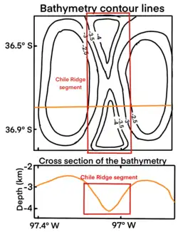 La batimetría[14] de la dorsal de Chile muestra que hay grandes colinas abisales que se extienden a lo largo de dos lados de la dorsal. Las colinas abisales crecen cíclicamente, lo que se debe al crecimiento cíclico de las fallas. Durante los ciclos de fallas, la extensión de la dorsal de Chile provocó la "difusión" tectónica (deformación que forma numerosas fallas diminutas). La continua divergencia de la dorsal hace que se concentre una deformación extensional y que las diminutas fallas se unan para generar altas y largas fallas a escala abisal. Las enormes fallas empujan a las viejas e inactivas fallas lejos del eje de la dorsal por la fuerza extensional. Este proceso se repetiría. Por lo tanto, cuanto más alejada esté la colina abisal del eje de la dorsal, mayor será su edad.[13]