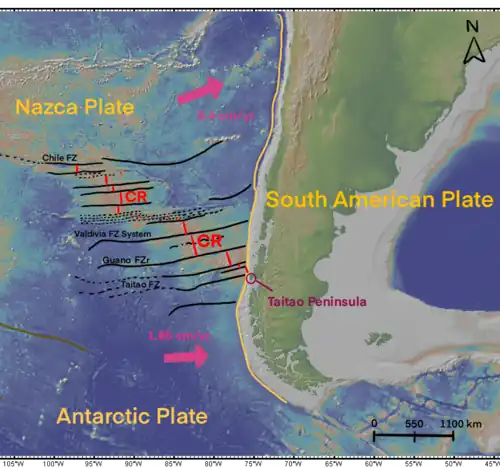 - ↑ (Apuntes en inglés) Kelly McGuire. Tectonics of South America: Chile Triple Junction. 2004