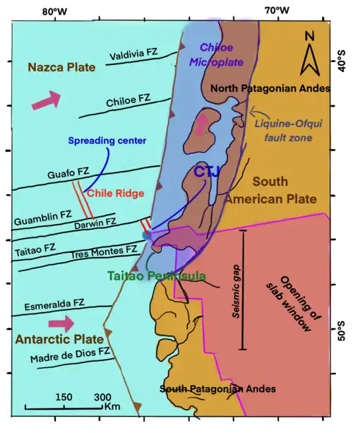 - ↑ a b c Suárez, Rodrigo; Sue, Christian; Ghiglione, Matías; Guillaume, Benjamin; Ramos, Miguel; Martinod, Joseph; Barberón, Vanesa (August 2021). «Seismotectonic implications of the South Chile ridge subduction beneath the Patagonian Andes». Terra Nova 33 (4): 364-374. Bibcode:2021TeNov..33..364S. ISSN 0954-4879. S2CID 233929593. doi:10.1111/ter.12521.