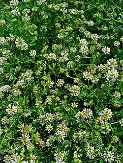 Es una planta herbácea, cuyos tallos y ramas son netamente leñosos perteneciente a la familia de las leguminosas. Hojas sentadas con folíolos lineares, pilosos por ambas caras. Flores pequeñas en umbela. Cáliz piloso. Corola blanca. El fruto es una legumbre ovoide. Florece en primavera y verano.