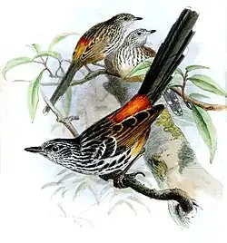 - ↑ a b c d Jobling, J. A. (2017). Drymophila Key to Scientific Names in Ornithology (en inglés). En: del Hoyo, J., Elliott, A., Sargatal, J., Christie, D.A. & de Juana, E. (eds.). Handbook of the Birds of the World Alive. Lynx Edicions, Barcelona. Consultado el 10 de agosto de 2017.