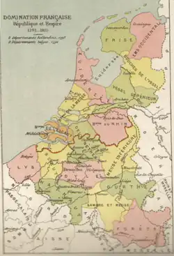 Francia, en guerra con todos los soberanos europeos, finalmente ganó en 1795. Y el sur de los Países Bajos, incluido Brabante, es cedido oficialmente por el emperador Francisco II, el último emperador electo del Sacro Imperio Romano, a Francia por el Tratado de Campoformio en 1797. La parte sur del Ducado de Brabante se divide en 1795 entre dos departamentos, el de Dyle en el sur (capital de Bruselas ) y el de Deux-Nèthes en el norte (ciudad principal de Amberes ).