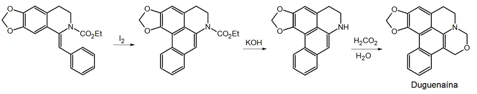 - ↑ Lenz, G.R. et al."A Biomimetic Synthesis of the Novel 6,7-Oxazine Ring-fused Dehydroaporphine Alkaloid Duguenaine" JCS Perkin (1984) v.1:pp.1273-1277