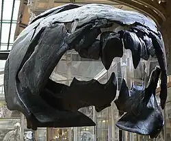 Cráneo juvenil de Dunkleosteus terrelli, en exhibición en el Museo de Historia Natural de Cleveland, Ohio, Estados Unidos. El cráneo fósil original fue recolectado por Peter Bungart en 1941 en Cleveland Shale, a lo largo del río Black, en el condado de Lorain, Ohio.