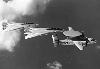 Durante la Guerra Fría, cada portaviones estadounidense contaba con 24 aviones de combate F-14, que se coordinaban con los cuatro aparatos E-2C Hawkeye para interceptar a los aviones enemigos. El E-2 Hawkeye es actualmente un miembro esencial del ala embarcada; cada una cuenta con 4 E-2 Hawkeye (en ocasiones cinco), para ser capaz de tener vigilancia continua las 24 horas del día. Un E-2 debe estar en vuelo, otro preparado y uno o dos en mantenimiento en el hangar del portaviones. Hasta 2005, la Armada estadounidense tenía un ala de E-2 en cada costa, asignados a cada flota. En 2005 se centralizó en un único ala en Point Mugu, California.[25]
