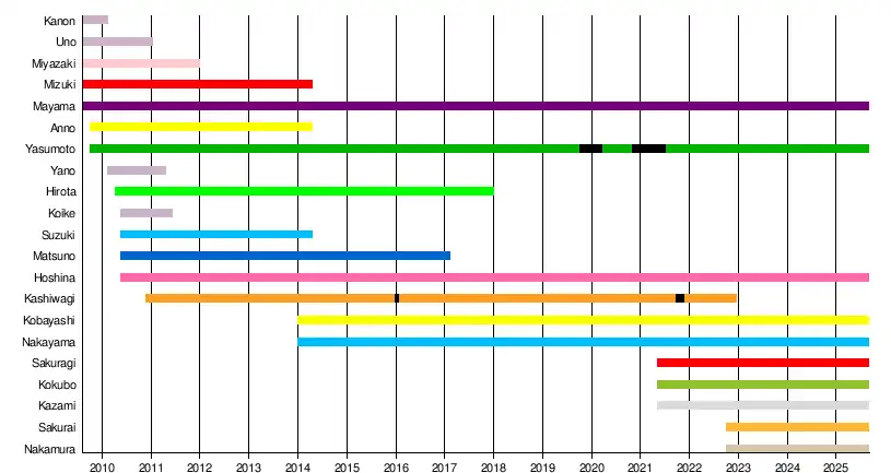 | 10 | Rio Koike (小池梨緒?) | 18 de enero de 1998 (27 años) | 22 de mayo de 2010 | 7 de junio de 2011