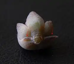 ![]() Vista de las dos bracteloas (flechas rojas) características de la sección Racemosae en una flor de E. racemosa var. racemosa. | ||