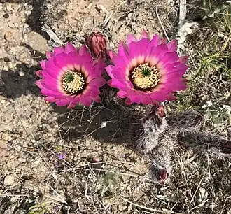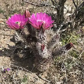 Florece en primavera. Las flores tienen forma de embudo y exhiben una tonalidad de color rosado claro a magenta con gargantas blancas (o al menos más pálidas) y centros rojo carmesí oscuro. Alcanzan unos 6 cm de largo y un diámetro de entre 5 y 7 cm. La yema floral es redonda, espinosa y presenta una cubierta lanosa. Las flores se abren a media mañana, se cierran por la noche y repiten este ciclo durante un periodo de 1 a 3 días.[3]