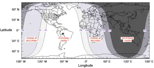 Será visible en América, África y Europa.[1] Al oeste de América del Norte, el eclipse coincidirá con la salida de la luna al atardecer del 27 de agosto. En América del Sur el eclipse se producirá cerca de la medianoche, mientras que en África y Europa ocurrirá en las horas previas al amanecer del 28 de agosto.