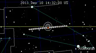 ![]() Representación del movimiento a través de la sombra de la Tierra en la constelación de Tauro, durante una hora. | |